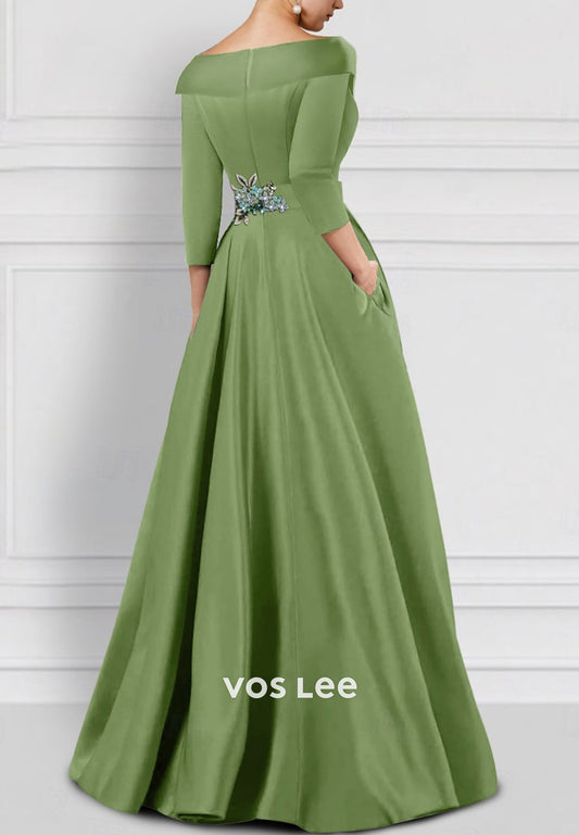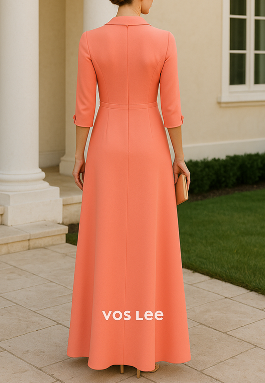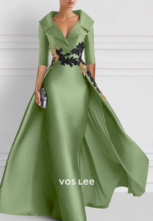 A-Line 3/4 Sleeve V Neck Floral Embossed Floor-Length Mother of Bride Dresses