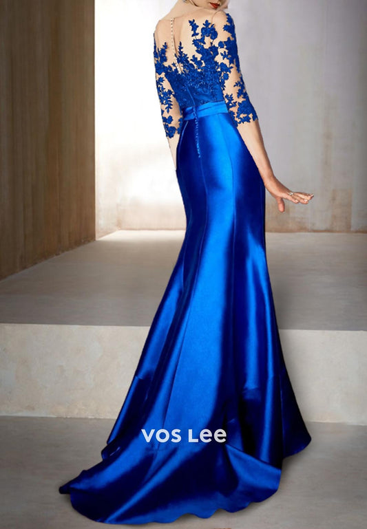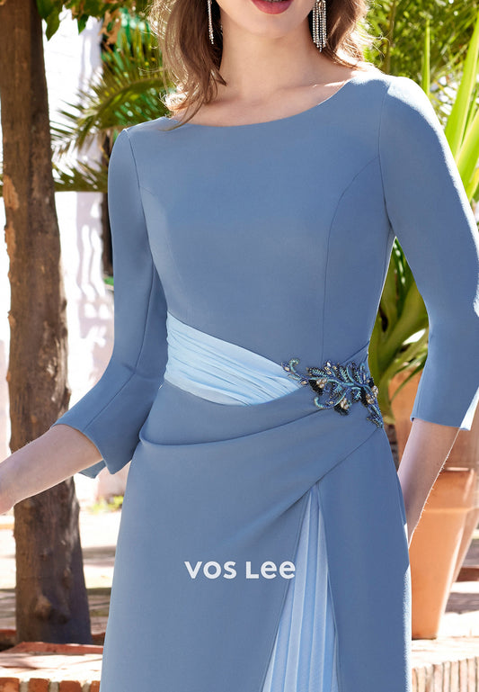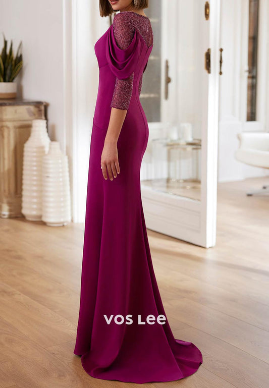 3/4 Sleeve Scoop Pleated Long Mermaid Mother of Bride Dresses with Sweep Train
