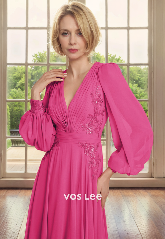 A Line V Neck Chiffon Lace Appliques Long Sleeves Mother of the Bride/Groom Dress Tea Length