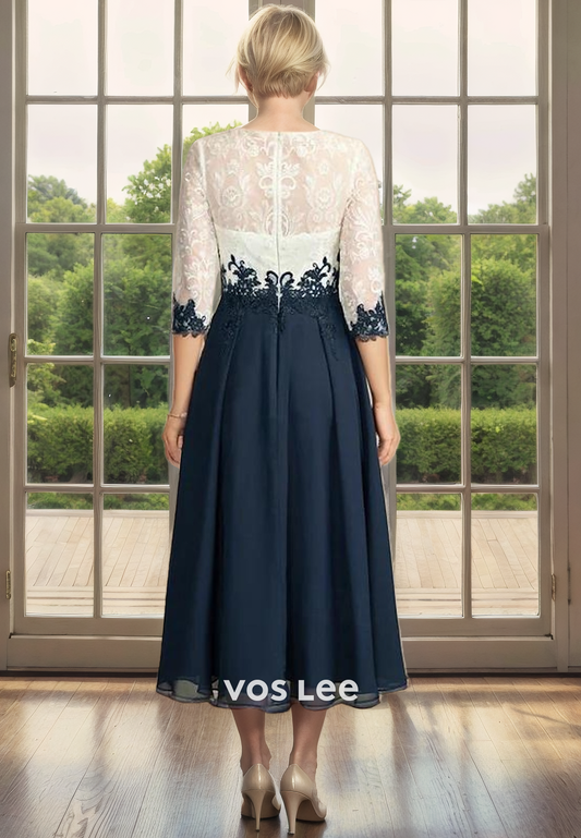 A-Line Bateau Illusion Tea-Length Chiffon Mother of the Bride Dress with Applique Lace