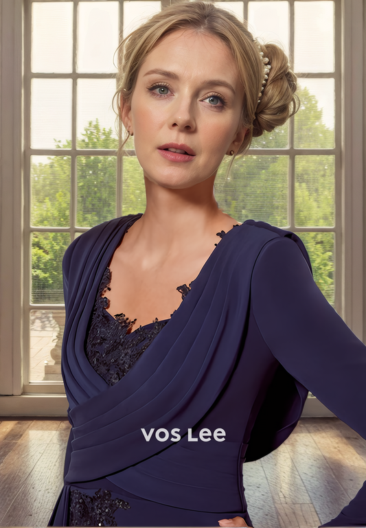 Navy V-Neck Long Sleeves A-Line Long Mother of the Bride Dress with Lace
