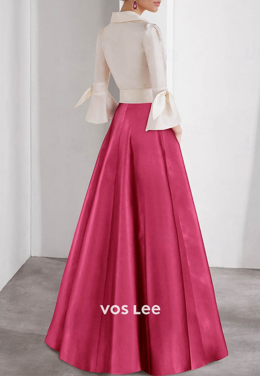 A-Line Bell Sleeves V Neck Bowknot Pleated Floor-Length Mother of Bride Dresses