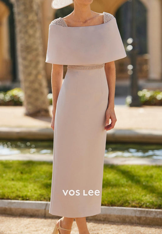 Classic Off the Shoulder Rhinestone Bowknot Sheath Tea-Length Mother of Bride Dresses