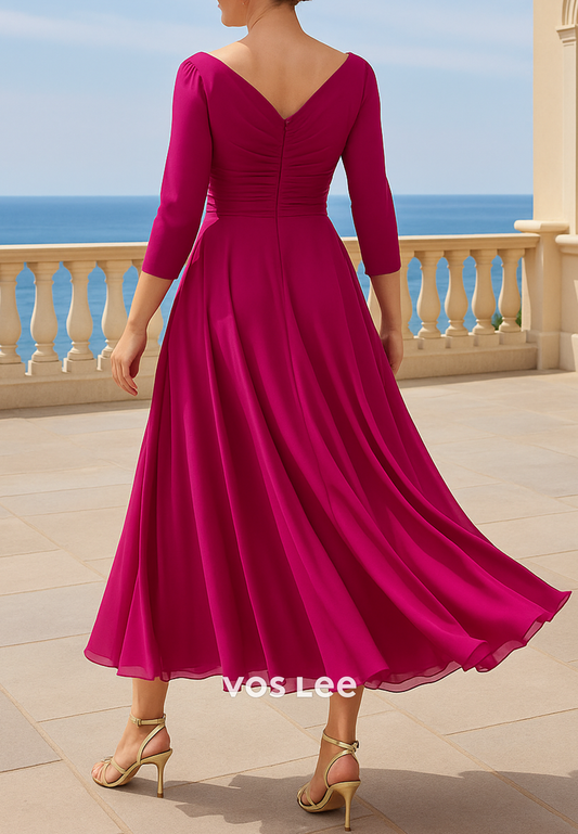 Couture & Ornate A-Line 3/4 Sleeve V Neck Tea-Length Pleated Mother of Bride Dresses