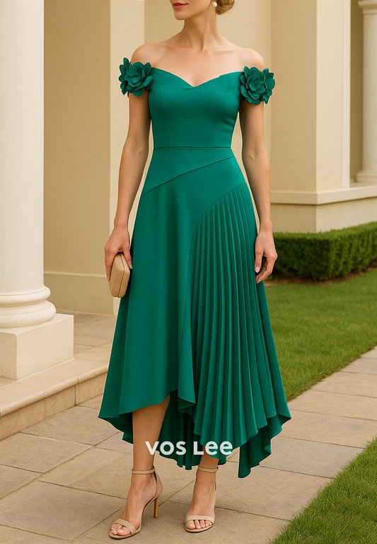 A-Line Off the Shoulder Pleated Floral Embellished Tea-Length Mother of Bride Dresses