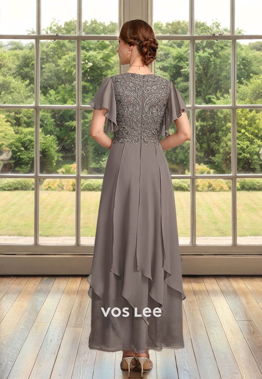 A-Line Short Sleeve V Neck Floral Embellished Mother of Bride Dresses with Pockets