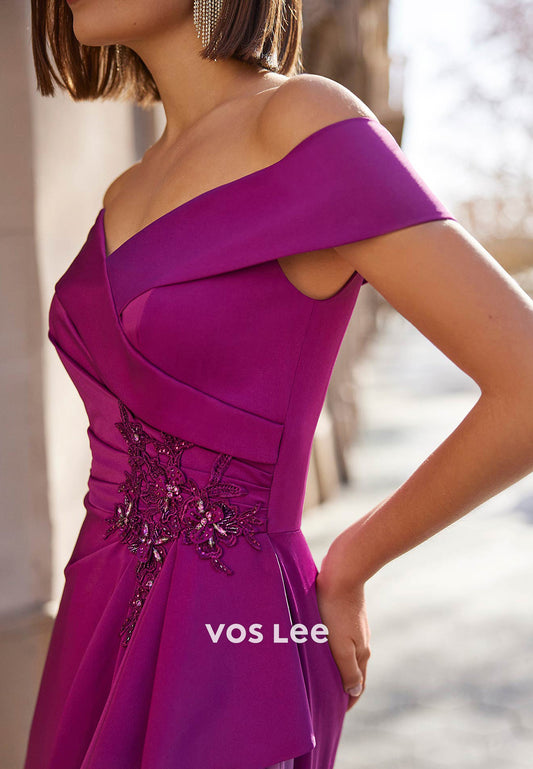 Ornate Sheath Off Shoulder Draped Floral Embossed Side Split Mother of the Bride Dress