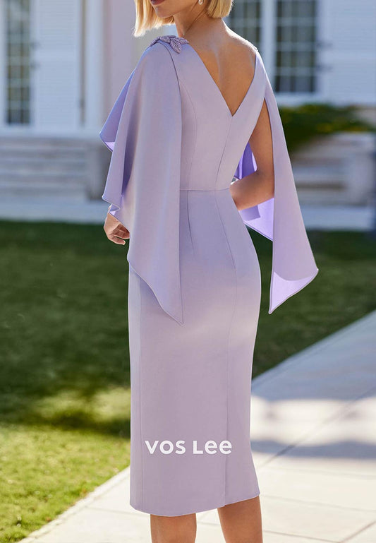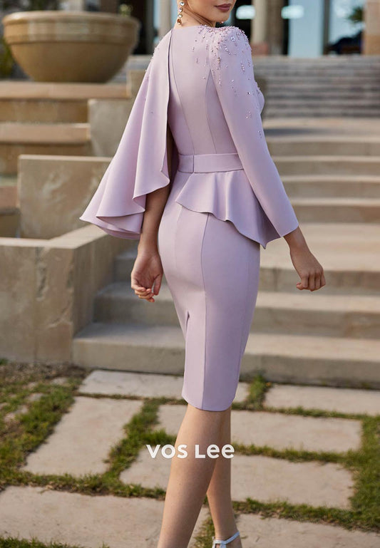Classic Long Sleeve V Neck Beaded Knee-Length Pleated Sheath Mother of Bride Dresses