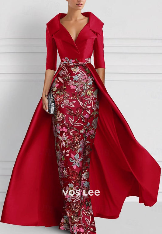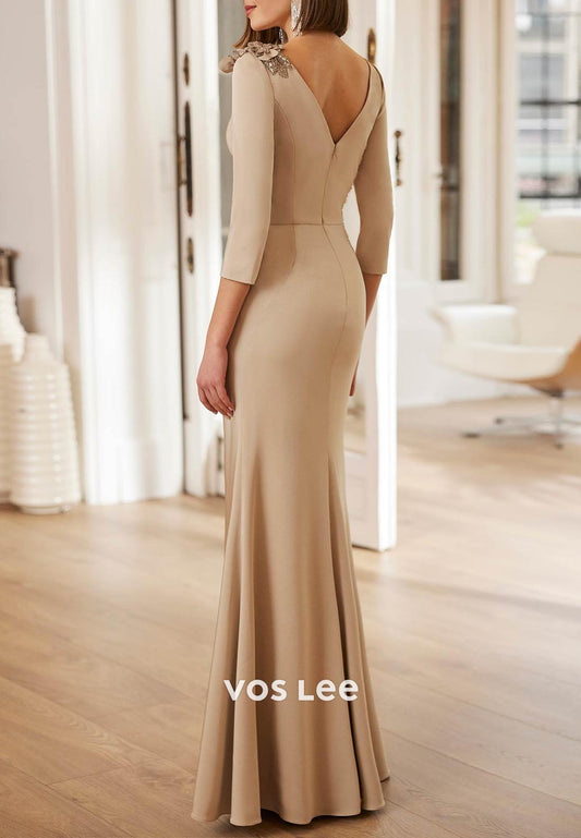 3/4 Sleeve V Neck Pleated Floral Embossed Floor-Length Sheath Mother of Bride Dresses