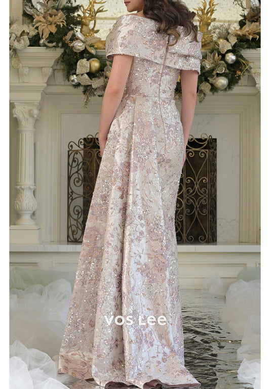 Short Sleeve One Shoulder Flowers Mermaid Mother of Bride Dresses with Side Split