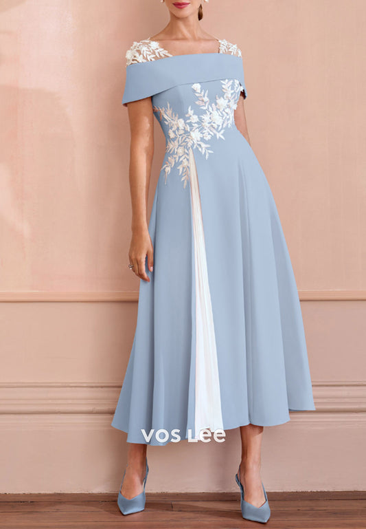 A-Line Short Sleeve Off-Shoulder Appliqued Tea-Length Pleated Mother of Bride Dresses