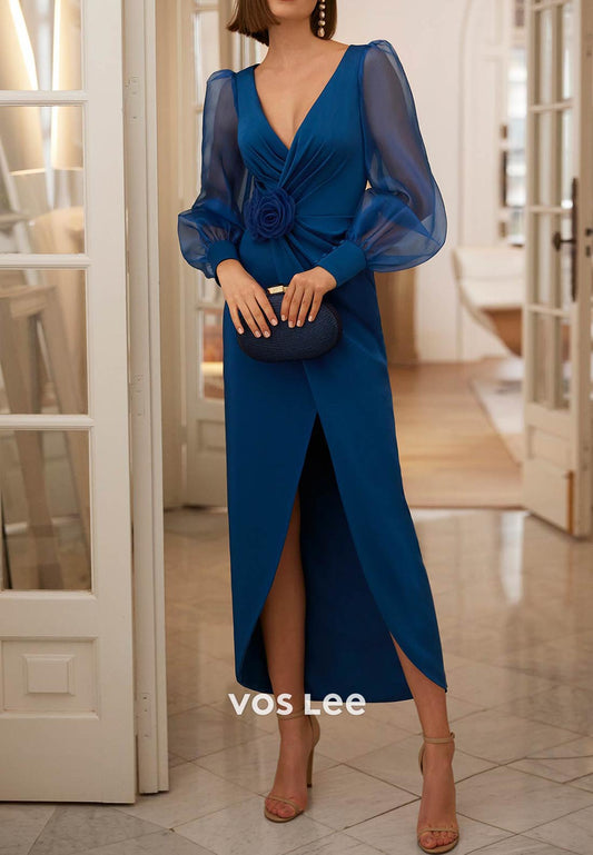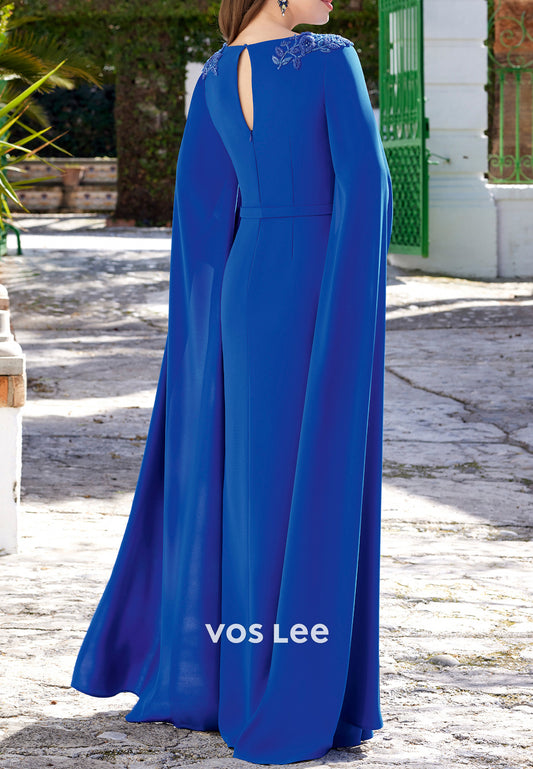 Royal Blue Long Sleeve Semi Formal Sheath Floor-Length Long Mother of Bride Dress