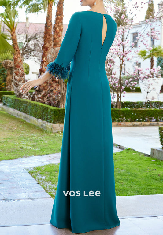 Casual 3/4 Sleeve Feather Sheath Semi Formal Floor-Length Mother of Bride Dress