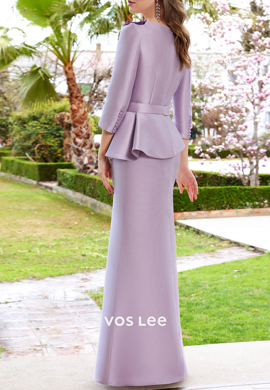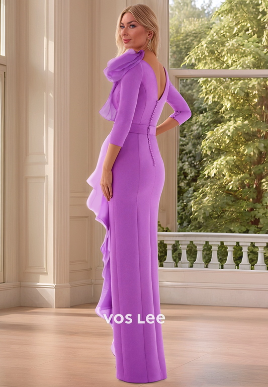Asymmetrical Neck 3/4 Sleeve Floor-Length Sheath Mother of Bride Dress with High Split