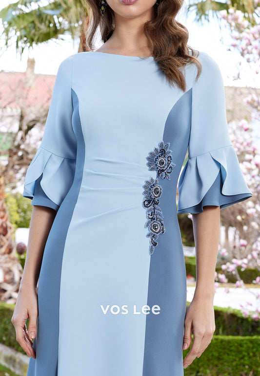 Blue Bell Sleeves Sheath Scoop Floor-Length Floral Embellished Mother of Bride Dress
