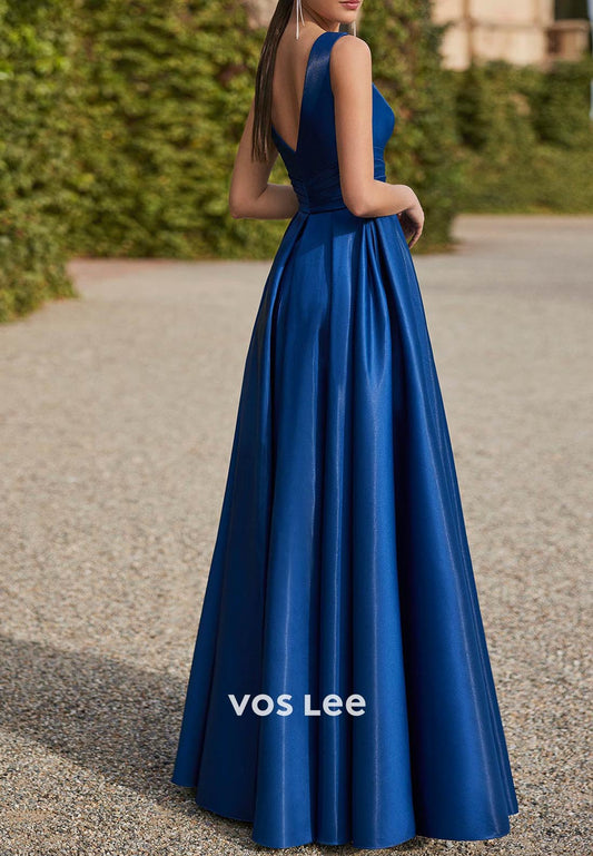 A-Line V Neck Pleated Bowknot Floor-Length Mother of Bride Dresses with pocket