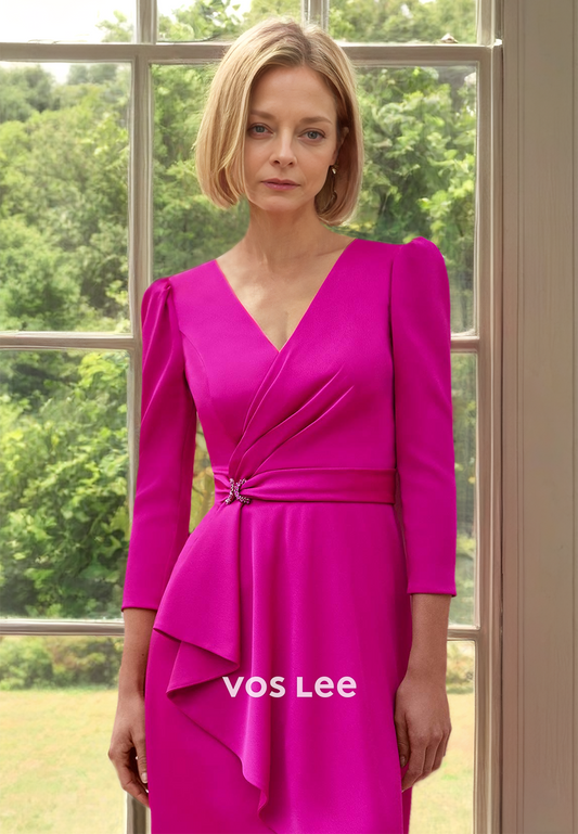 Simple A-Line V Neck Half Sleeves Pleated Long Fuchsia Satin Mother of the Bride Dress