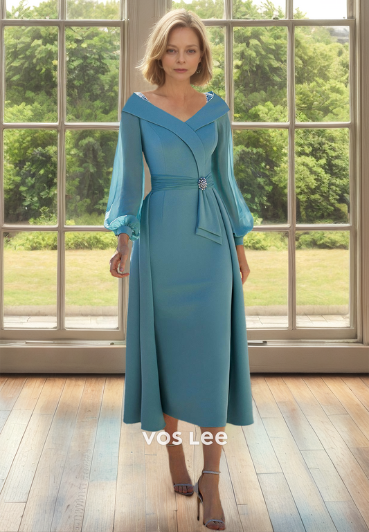 Simple V NeckA-Line Long Sleeves Bow Tea Length Mother of the Bride Dress