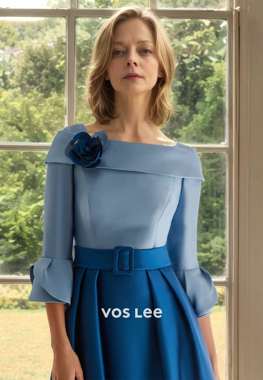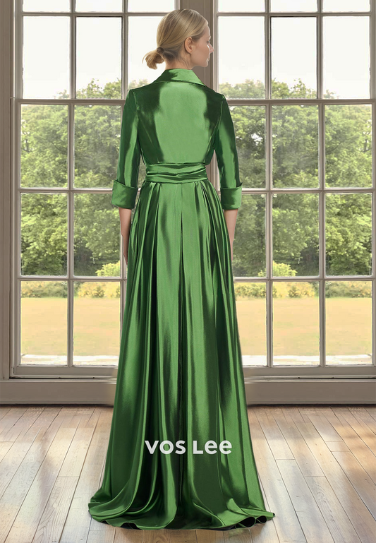 Elegant A-Line V Neck Half Sleeves Button Belt Satin Mother of the Formal Dress