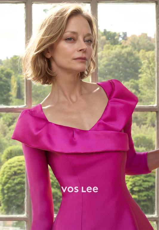 Classy Sheath V Neck Long Sleeves High Low Satin Mother of the Bride Dress