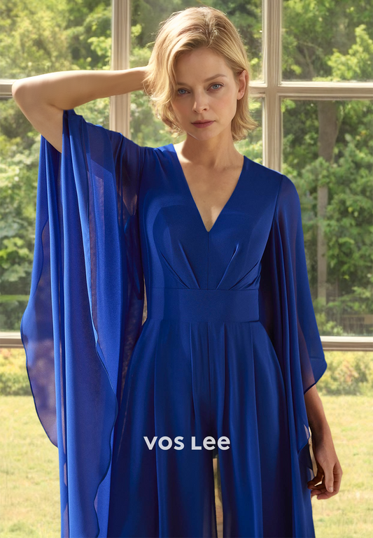 Modest V Neck Long Sleeves Jumpsuits Long Satin Mother of the Evening Dress