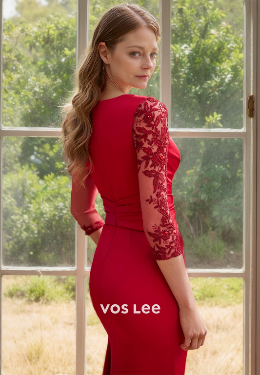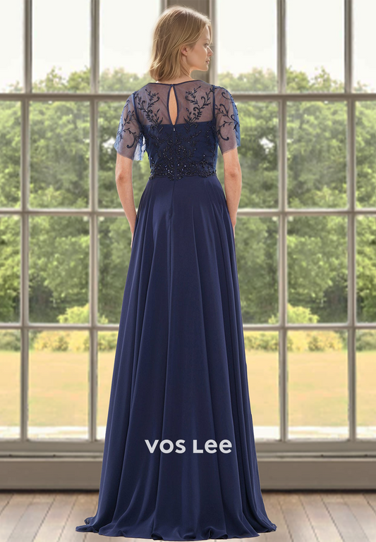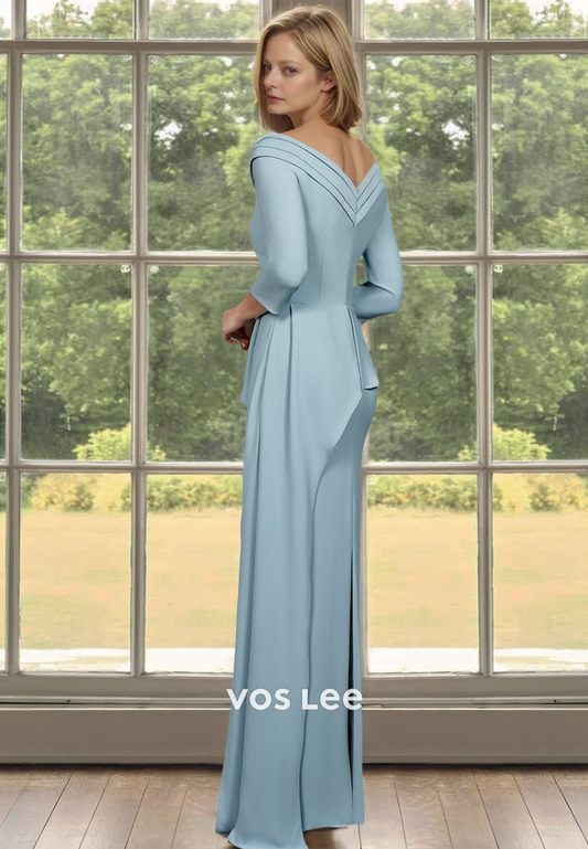 Simple Column V Neck Half Sleeves Side Split Floor Length Mother of the Bride Dress