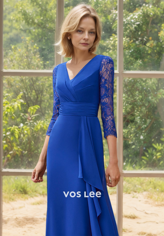 Graceful Column V Neck Half Sleeves Lace Appliques Ruffled Mother of the Bride Dress