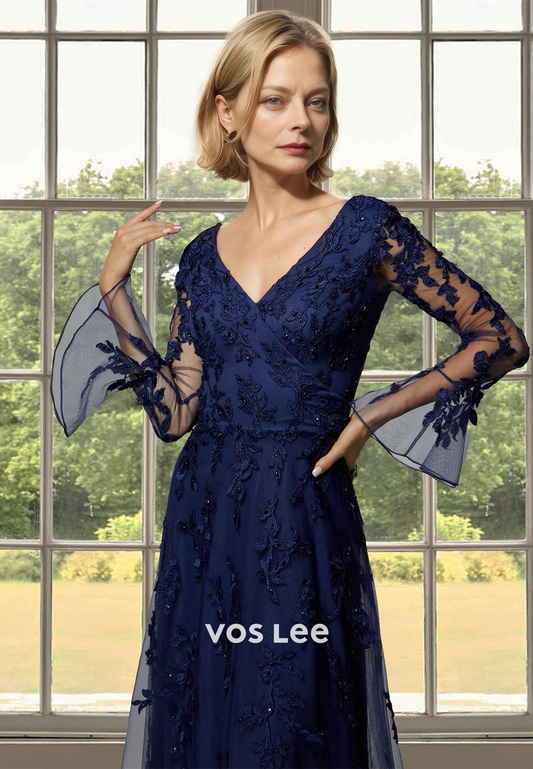 Gorgeous A-Line V Neck Long Sleeves Sweep Train Tulle Mother of the Bride Dress