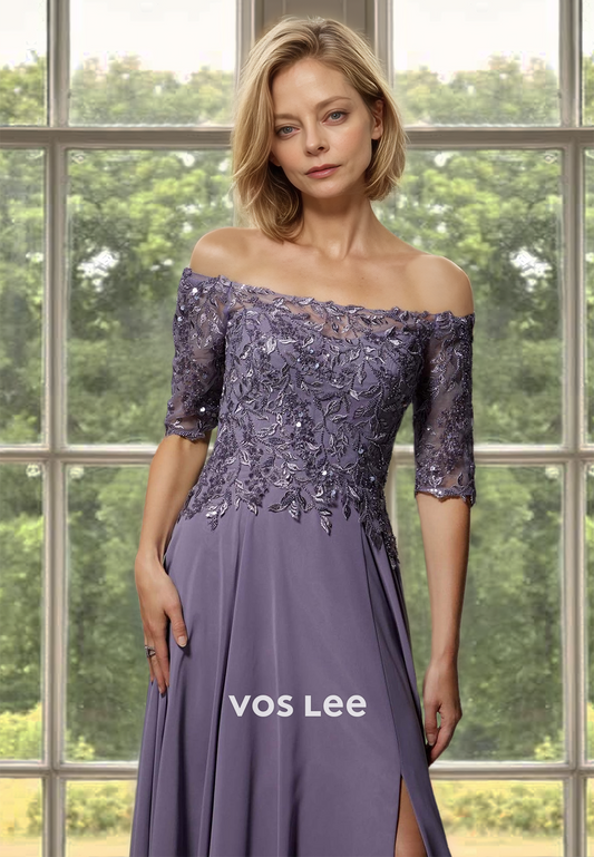 Charming A-Line Off Shoulder Half Sleeves Lace Appliques Mother of the Bride Dress