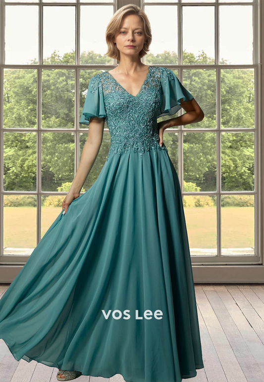 Luxury A-Line V Neck Half Sleeves Lace Appliques Tulle Mother of the Bride Dress