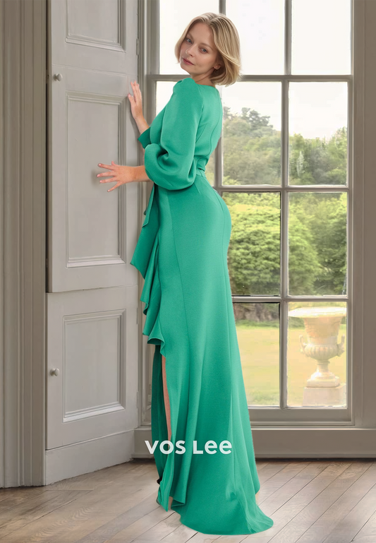 Simple Column V Neck Long Sleeves Ruffled Long Satin Mother of the Bride Dress