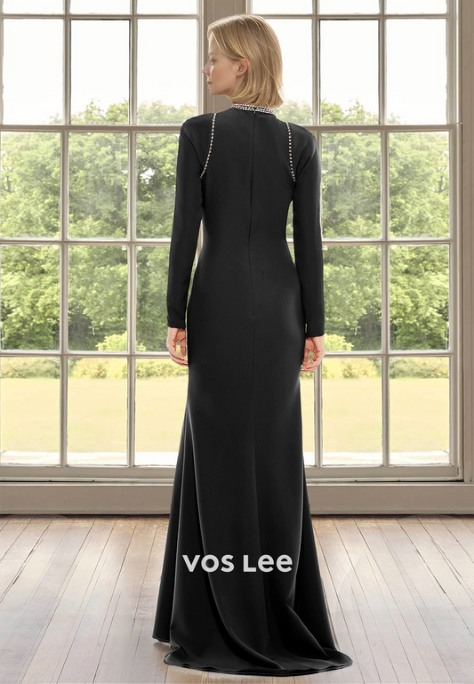 Elegant Column V Neck Long Sleeves Beaded Satin Mother of the Evening Dress