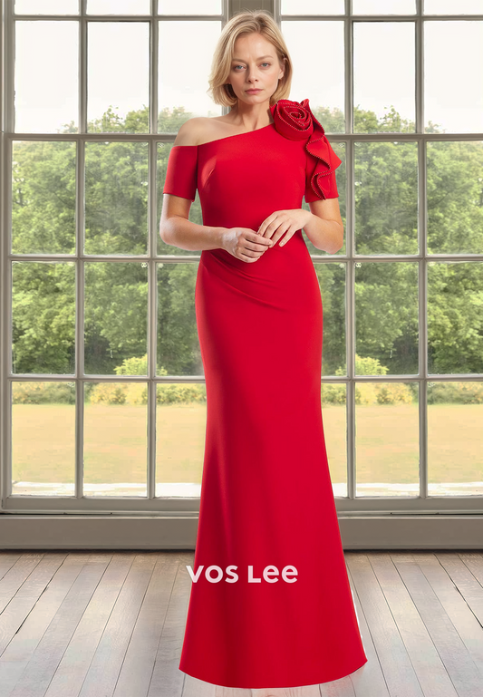 Simple Sheath One Shoulder 3D Floral Short Sleeves Long Satin Mother of the Party Dress