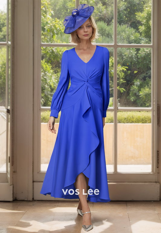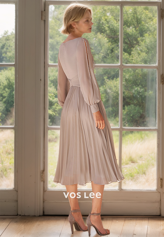 Modest A-Line V Neck Long Sleeves Pleated Tea Length Mother of the Bride Dress
