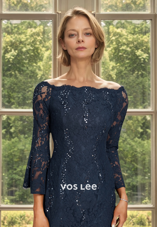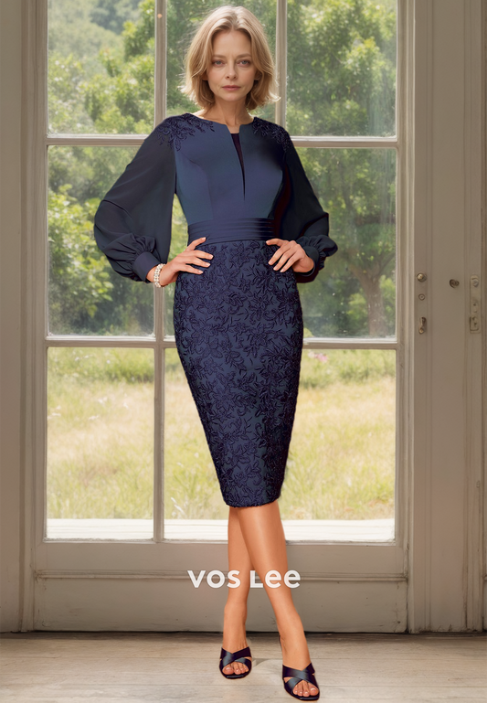 Luxury Bateau Long Sleeves Lace Appliques Knee Length Mother of the Bride Dress