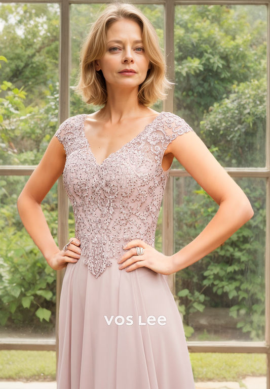 Gorgeous A-Line Cap Sleeves Lace Appliques V Neck Pleated Mother of the Bride Dress