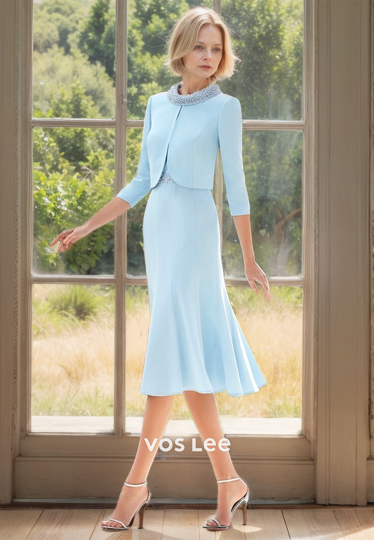 Elegant Scoop Neck Long Sleeves Beaded Ruffled Knee Length Mother of the Bride Dress