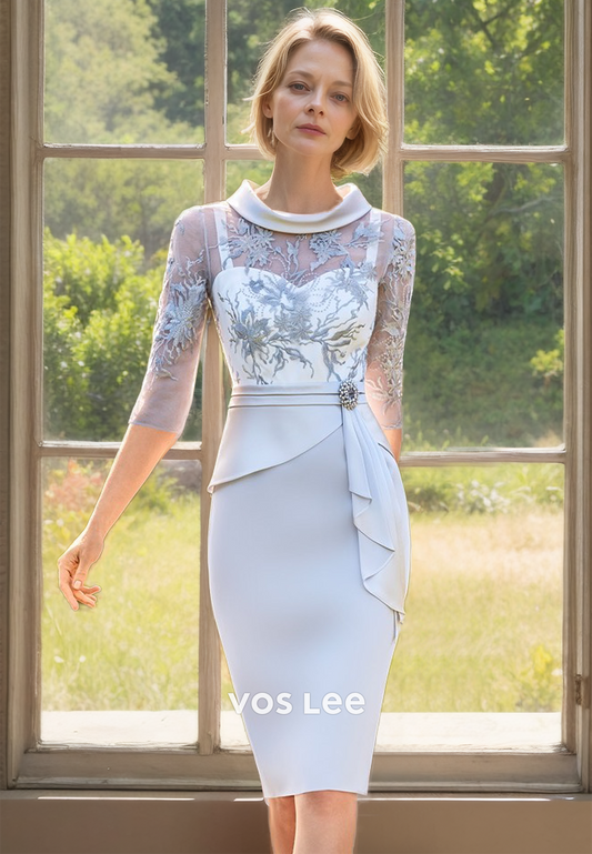 Bateau Sheath Half Sleeves Knee Length Lace Appliques Mother of the Formal Dress