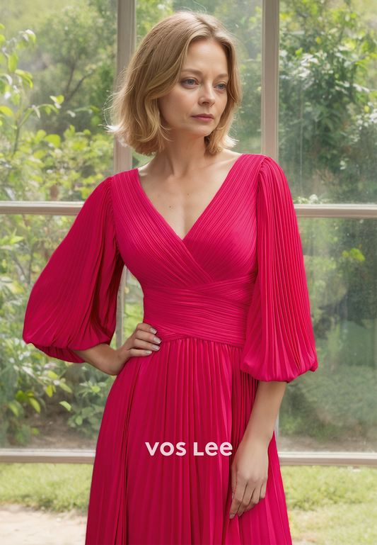 Classy A-Line V Neck Long Sleeves Tea Length Pleated Mother of the Evening Dress