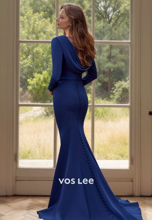 Sheath Royal Blue Scoop Neck Long Sleeves Ruched Satin Mother of the Formal Dress