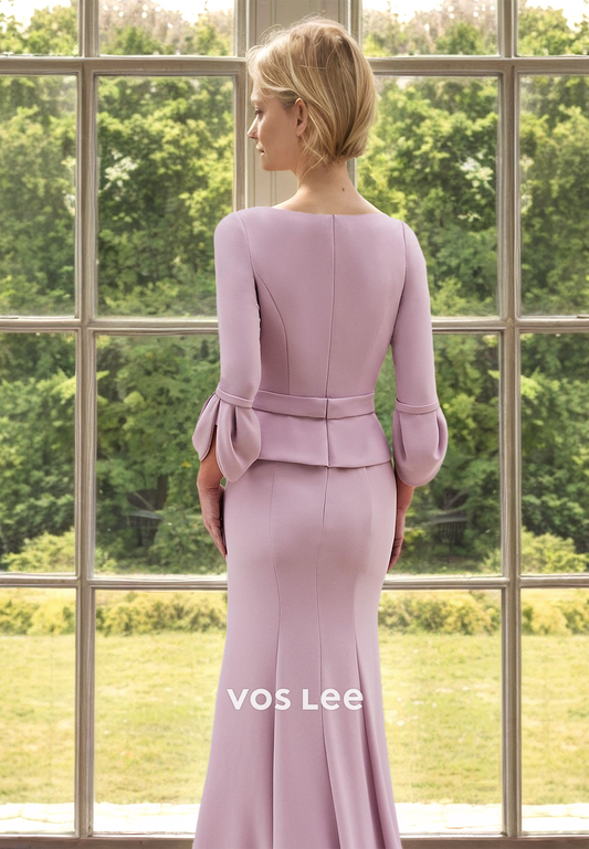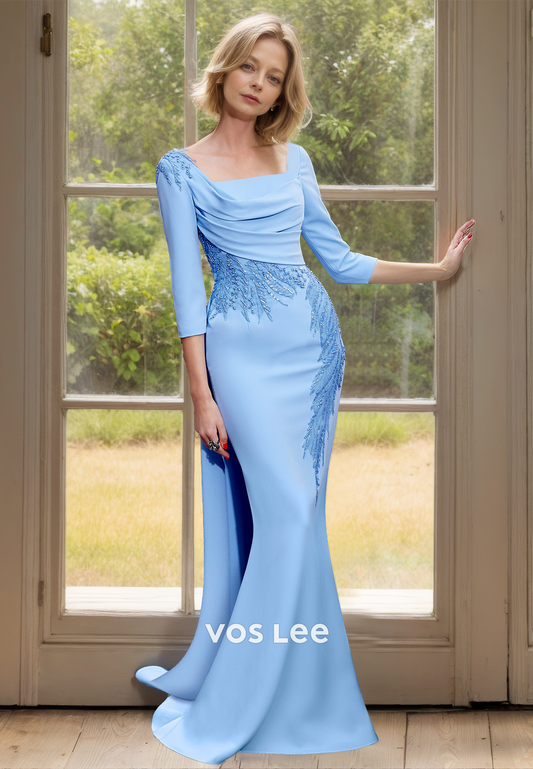 Unique Square Neck Long Sleeves Column Beaded Satin Mother of the Formal Dress