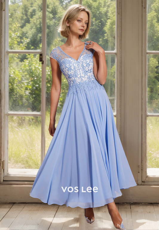 Vintage V Neck Cap Sleeves A-Line Tea Length Pleated Mother of the Formal Dress