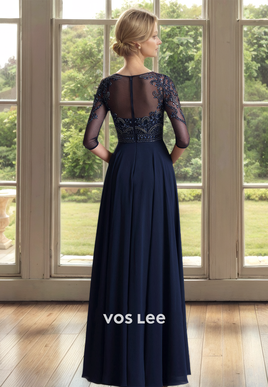 Ornate A-Line Bateau Half Sleeves Illusion Pleated Floor Length Mother of the Formal Dress