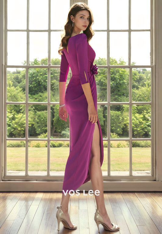 Elegant Ruffled Long Sleeves Floor Length Mother of the Bride Dress with Side Slit