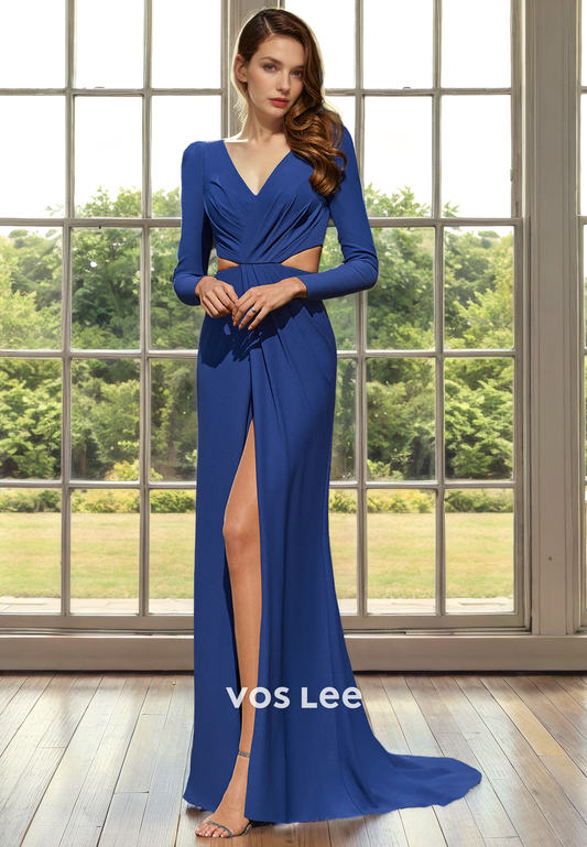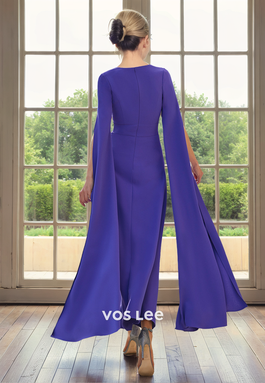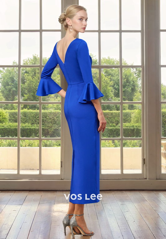 Royal Blue Ankle Length Mother of the Bride Dress with Long Sleeves V Neck Elegant Party Dresses
