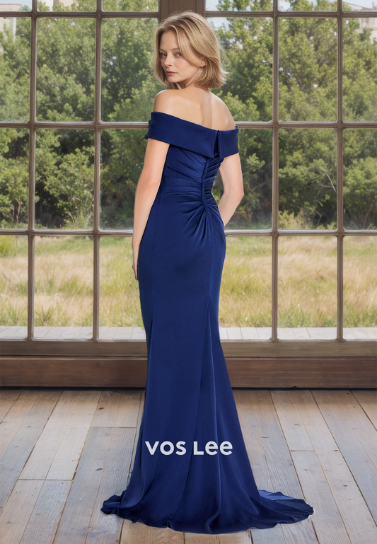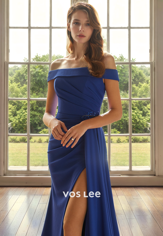 Column Formal Off-Shoulder Pleated High Split Mother of the Bride Dresses Floor Length