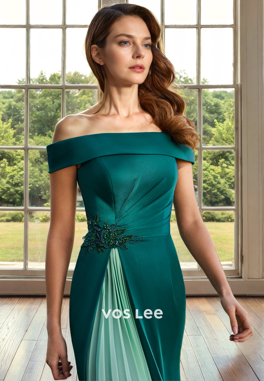 Elegant Green Pleated Mother of the Bride Dress Off-Shoulder Satin Floor Length Cocktail Dresses