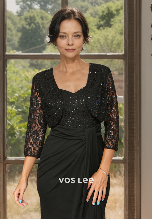 Luxury Sweetheart Chiffon Cap Sleeves Black Mother of the Bride Dress with Soaghetti Straps