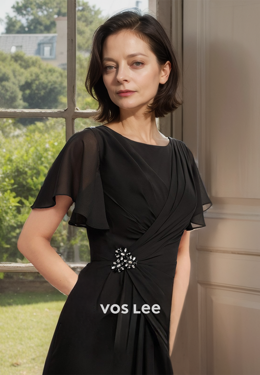Modest Chiffon Black Column Scoop Ankle Length Mother of the Bride Dresses with Short Sleeves