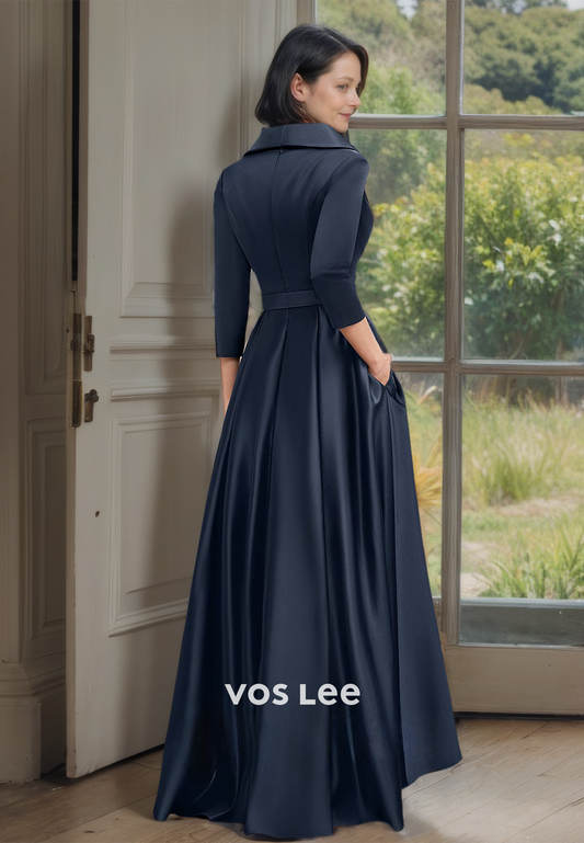 V Neck A-Line Neptune Formal Satin Mother of the Bride Dress with Long Sleeves